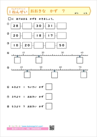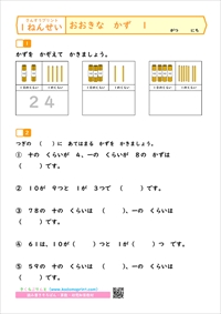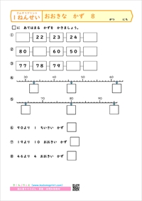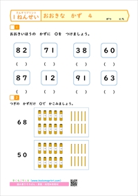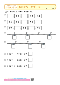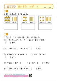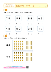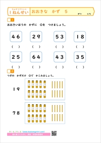 1~99までの「数のしくみ」、「数字の書き方」、「大きさくらべ」などが練習できます。