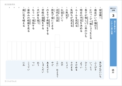 こくご 小3東書 漢字 【東京書籍】漢字3年 3学期③ 小学校3年生、漢字プリントの東京書籍版です。 「漢字を使おう9」「くわしく表す言葉」を参考にしています。 もくじ漢字3年 3学期新出漢字練習プリントテストその他のプリント 漢字3年 3学期 新出漢字 第 福 等 定 宮 宿 追 庭 練習プリント テスト その他のプリント 【東京書籍準拠】小3漢字プリント 一覧ページ2024.11.29小学校3年生、漢字プリントの東京書籍版一覧ページです。 令和6年改訂版に対応しています。 3年生で習う漢字 全漢字のなぞり書きプリント https://kodomoprint.co... さくらぷりんとHOME サイト内検索